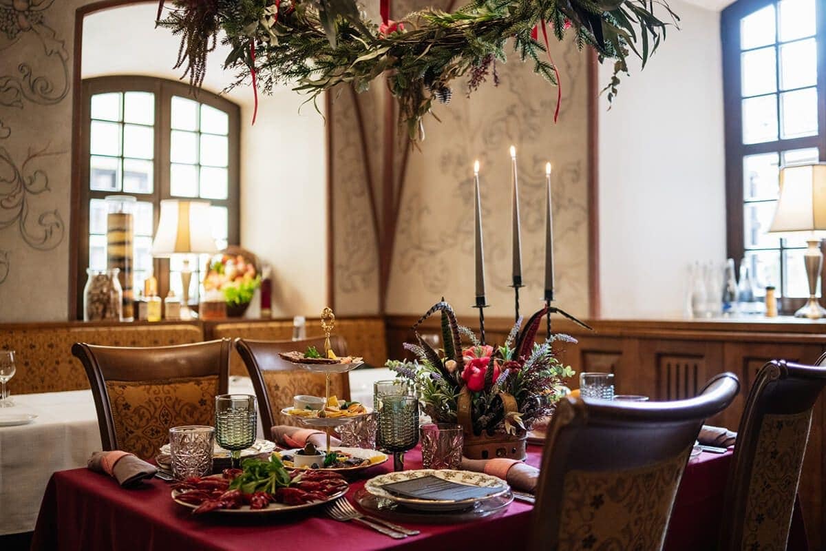 - Renesansinė menė, kurioje vyks puota, išpuošta keturių metų laikų miško ir sodo augalų dekoracijomis. Apsupti sodo ir miško augalų girliandų ir vainikų, jūsų mintys ir gido pasakojimai padės įsijausti kokia gilia ir prasminga istorija alsuoja mūrai kuriuose vakarieniaujate
